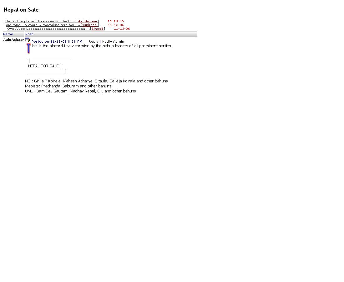 Really, didn't want to get into this game of decency by some self proclaimed culturist. AaluAchar, you are DISGUSTING. I am not sure if you are another variation of Sajha-bot Kali Kali, but you are more disgusting than a real porno on the sajha forum. Bhunte, most of the times, I like the way you put your opinions, but you have a blind faith here. No, not everyone is right just because they criticize Nas. And, AaluAchar, did your son not ask you anything when you wrote "Nepal on Sale?" And San, why don't you just ban the racists yet again? I know I am harsh here, but I don't see another reason being nice to a Nepali culturist and racist. :) This is it (Click here for the details)