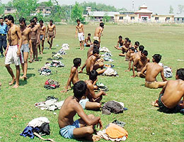 नेपाल प्रहरीमा भर्ती हुन छाती नाप्न गौरस्थित जिल्ला प्रहरी कार्यालय रौतहट परिसरमा सोमबार प्रतीक्षा गर्दै युवा । जिल्ला प्रहरी कार्यालयले १० जना जवानका लागि दरखास्त आह्वान गरेकामा ३३ ले निवेदन दिएका छन्