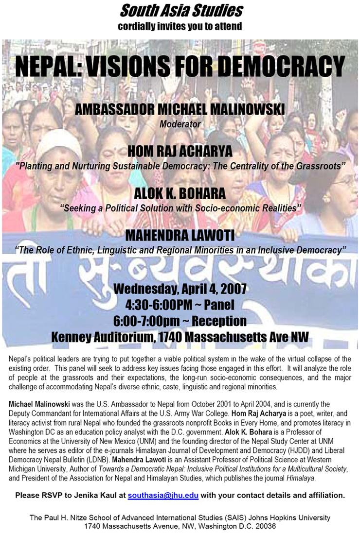 Invitation to a workshop in Columbia University this Friday. --------------------------------------------------- SIPA, Columbia University Invites you to a Workshop: “Constituent Assembly, Constitutional Process and the Building of a Democratic State in Nepal†Hosted by Prof. Jenik Radon Date: Friday, April 13, 2007 Time: 1:30 – 6:30 pm Venue: Columbia University Law School 435 West 116th Street at Amsterdam Ave, New York, NY 10027 Room JG-101 Exactly one year after the signing of the 12 point agreement reached between the Maoists and the Seven Party Alliance the two sides signed a comprehensive peace agreement on November 16, 2006. The events that led to this accord were launched by the people’s movement in April 2006 and are truly historic. With the signing of the agreement, the cease fire became permanent and finally the UN assisted with the arms management - two key issues that leveled the ground for implementing the peace agreement and for the peaceful construction of a stable democracy in Nepal. Another key issue was the passing of the Nepal Citizenship Act 2006, whereby all those born in Nepal before the second week of April 1990 are to be given citizenship under certain conditions. This would help thousands of formerly stateless people to exercise their rights and to fulfill their obligations as citizens of Nepal. However, there are many challenges the Nepalese people have to tackle before and also after the elections to the Constituent Assembly officially still set for June 2007. With an interim parliament and an interim constitution in place, the country is still facing serious questions as to how to provide for inclusion and equal representation of all ethnic and other groups, clarify the separation of powers, and many more issues. In order to discuss and find solutions for some of these challenges we cordially invite you to join us for the first of a series of workshops entitled “Constituent Assembly, Constitutional Process and the Building of a Democratic State in Nepalâ€. Our goal is to analyze some of these questions, how they impact the Nepalese people and to draft working papers on these issues so as to contribute to the democracy process in Nepal. As we are aiming for a concentrated and result-oriented working seminar, we encourage people truly committed to the cause of the democracy process in Nepal to sign up for this workshop. Since there will be a limited number of seats, please RSVP to Jasmine Henz (jh2698@columbia.edu) and for questions, please contact Prof. Jenik Radon (jr2218@columbia.edu) or Jasmine Henz (jh2698@columbia.edu). -------------------------------------------------