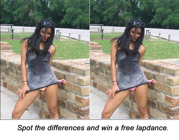 You didn't say how many brotha??? I can spot one.. her panties are different color.. below her right thigh from her side.. the gravel is missing.. can't think of none.. you didn't say how many.. that is all I can see at this time.. LOL