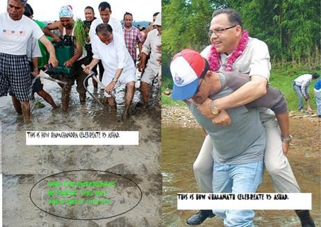 यी दुई नेता हरु नेपालका दुई प्रमुख पार्टी हाकेर देश लाई नेत्रित्व दिने सपना देखिरहेका छन। यिनीहरु ले  किसान  लाई देख्ने दिन भनेको १५ आशाद नै होला । तर पनी यि दुई ले १५ आशाद मनाएको तरिका म केही फरक देख्नु हुन्छ भने मलाई भन्दिनुउस न है !!!